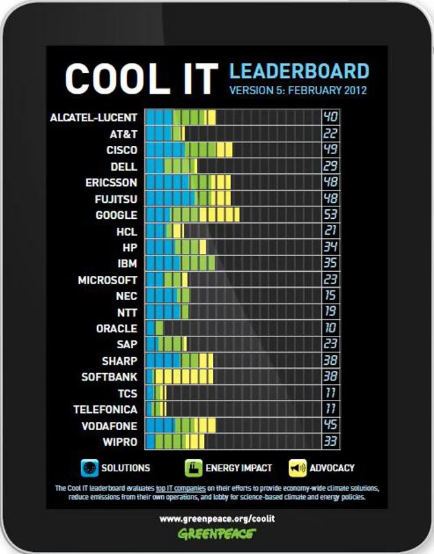 Greenpeace a rendu public son classement Cool IT 2012, un classement qui a vocation à promouvoir les entreprises les plus responsables face en l’environnement dans le secteur des NTIC (nouvelles technologies de l’information et de la communication). Le classement tient compte des solutions et mesures mises en oeuvre pour réduire l’impact environnemental de l’entreprise et de leur contribution au débat public.