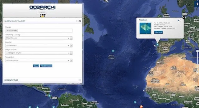 L’organisation Ocearch s’est donné pour mission de récolter des données sur les requins blancs qu’ils ont bagué : mouvement, santé, évolution, biologie … Un ensemble de données qu’il est possible de consulter via une carte dynamique qu’ils ont mis en ligne. Une application disponible sur leur site web, IOS et Android qui permet de connaitre les caractéristiques de chacun des requins blancs, ainsi que leur déplacements.