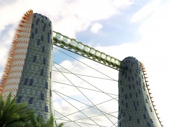 Le concept se caractérise par 2 grandes tours disposées sur une surface métallique circulaire creuse. Le soleil réchauffe l’air qui circule à l’intérieur du cylindre, entrainant ainsi l’air chaud vers le haut des 2 tours équipées de turbines éoliennes.