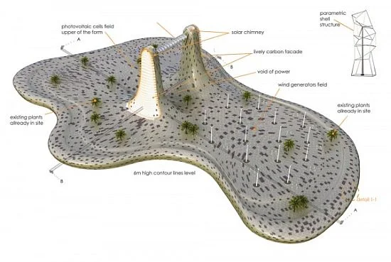L’architecte égyptien Karim Elnabawy à imaginé un concept de centrale électrique durable produisant de l’énergie renouvelable pour les personnes vivant aux alentours de Dubaï …